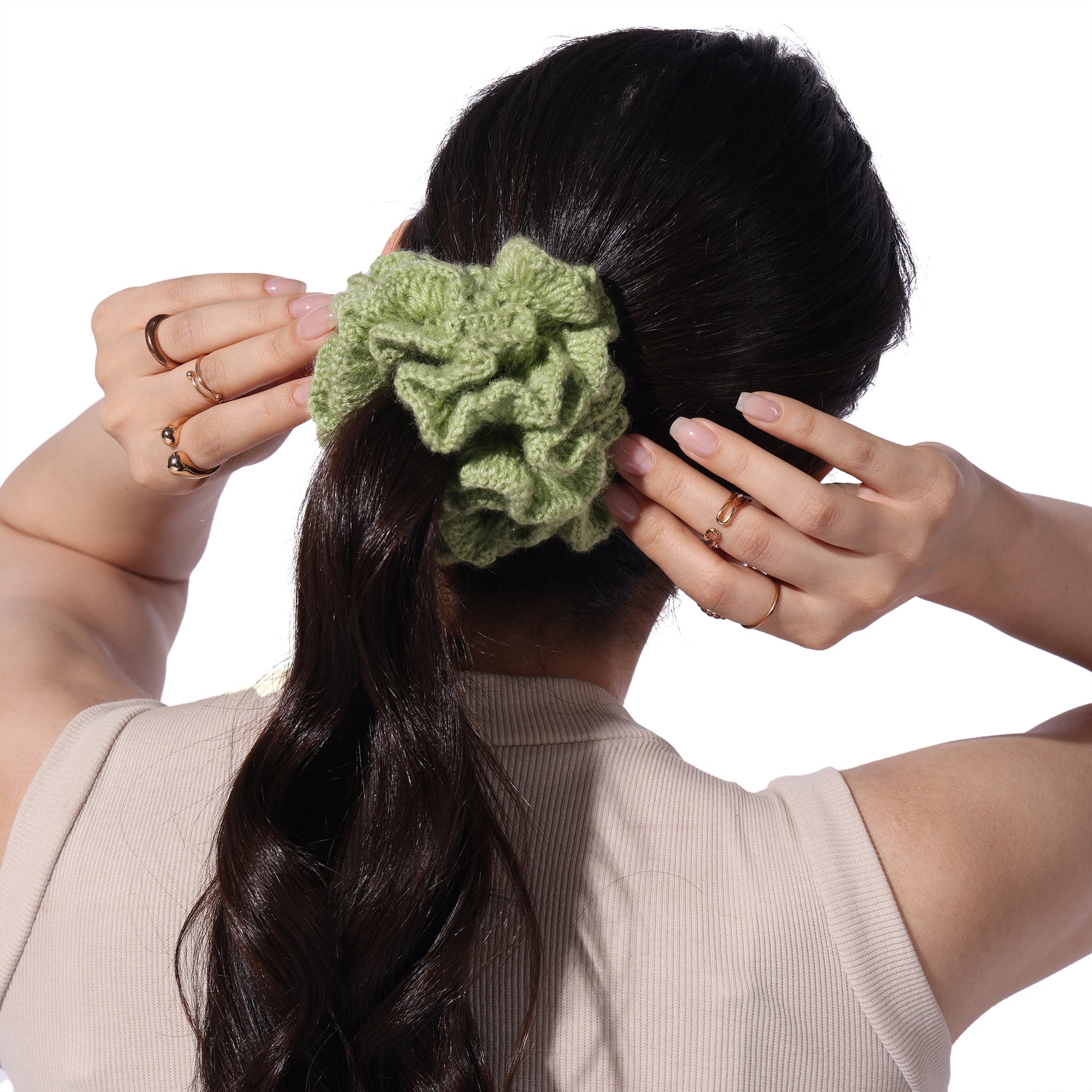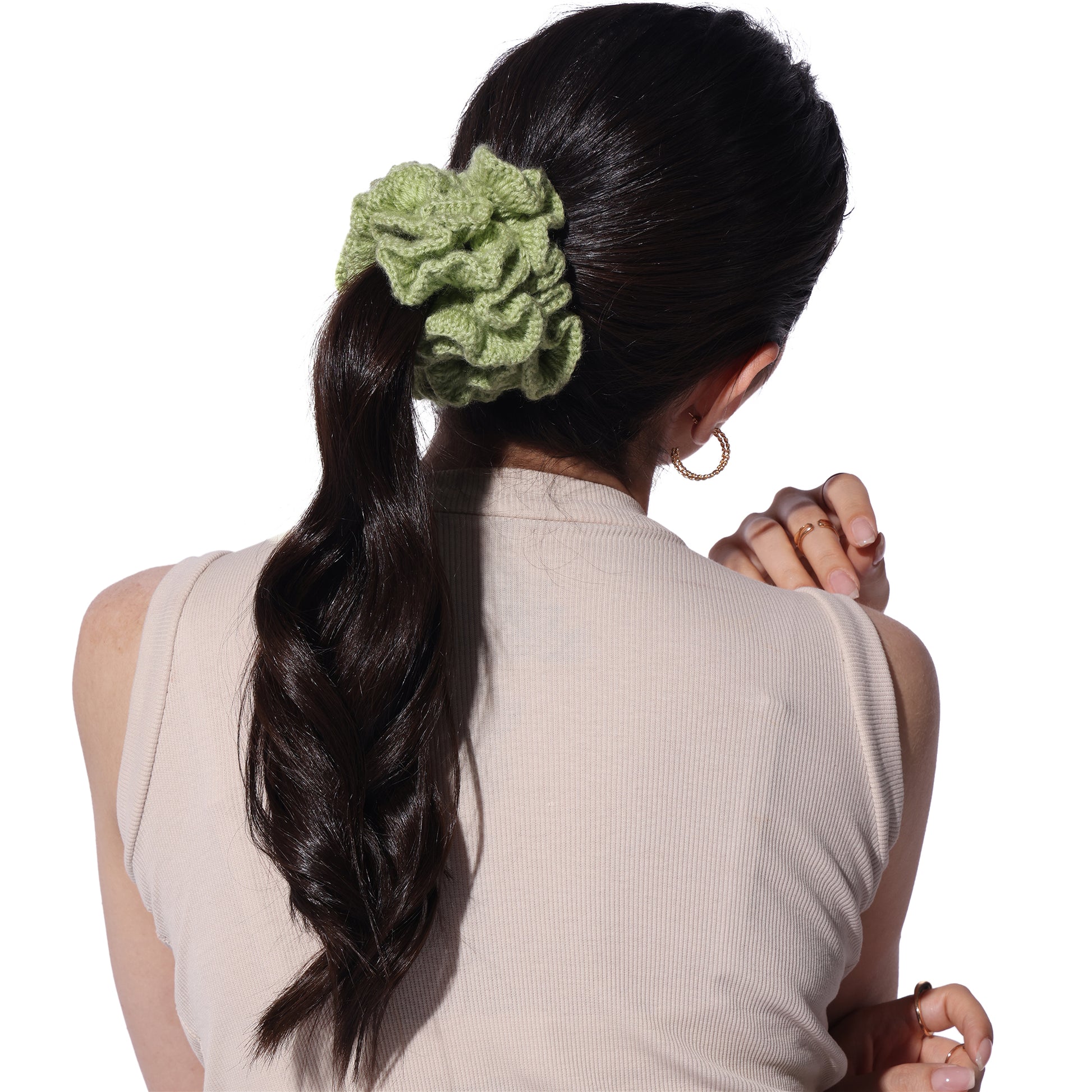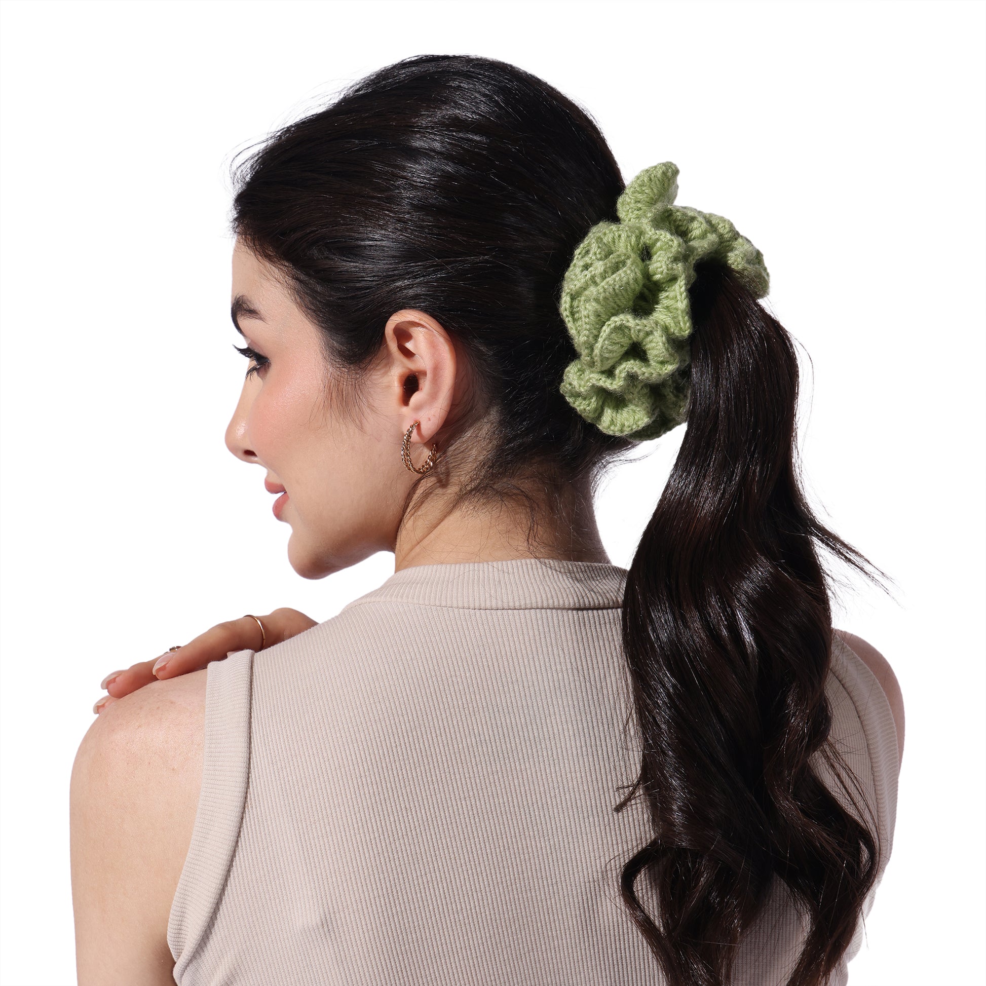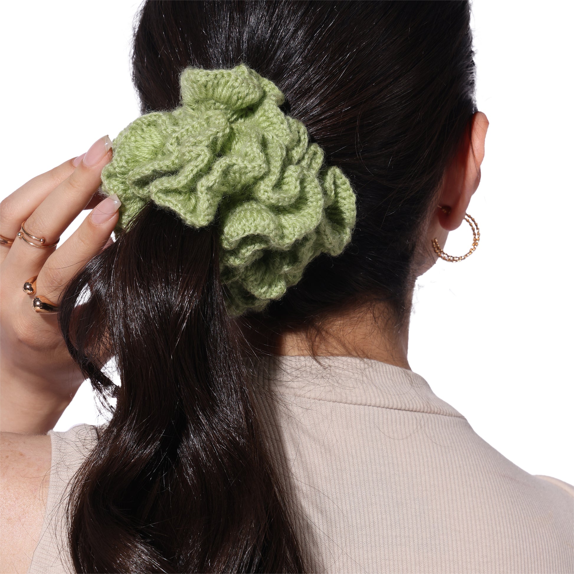 Details : Add a touch of charm and comfort to your hair game with our Crochet Handmade Scrunchie – a delightful blend of cute aesthetics and everyday function. Lovingly handcrafted with soft yarn, this scrunchie is gentle on your hair, prevents breakage, and looks oh-so-pretty on your wrist too!. Whether you're tying up a bun or accessorizing your braid, this scrunchie adds that perfect boho vibe to your look.