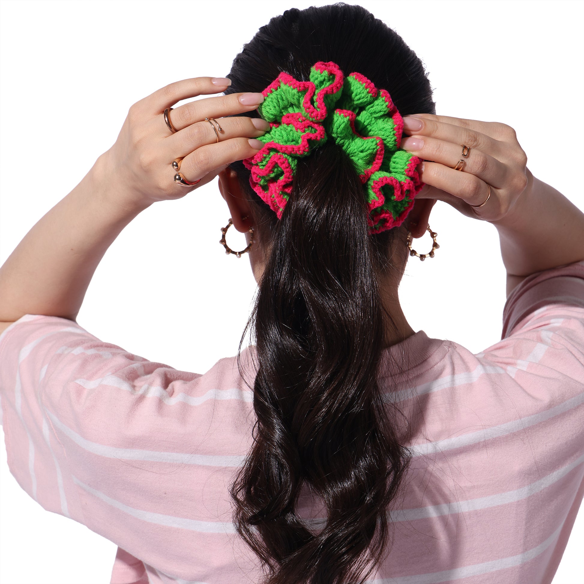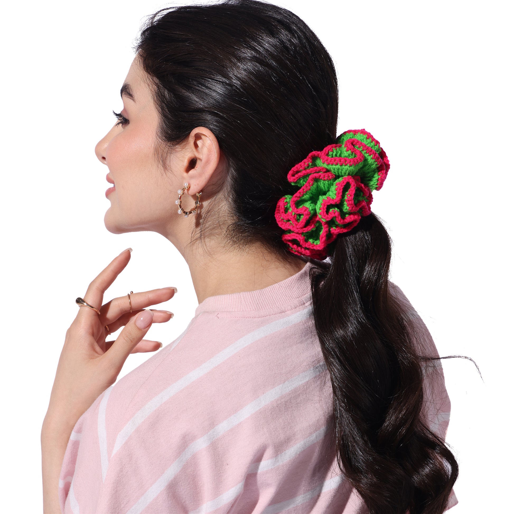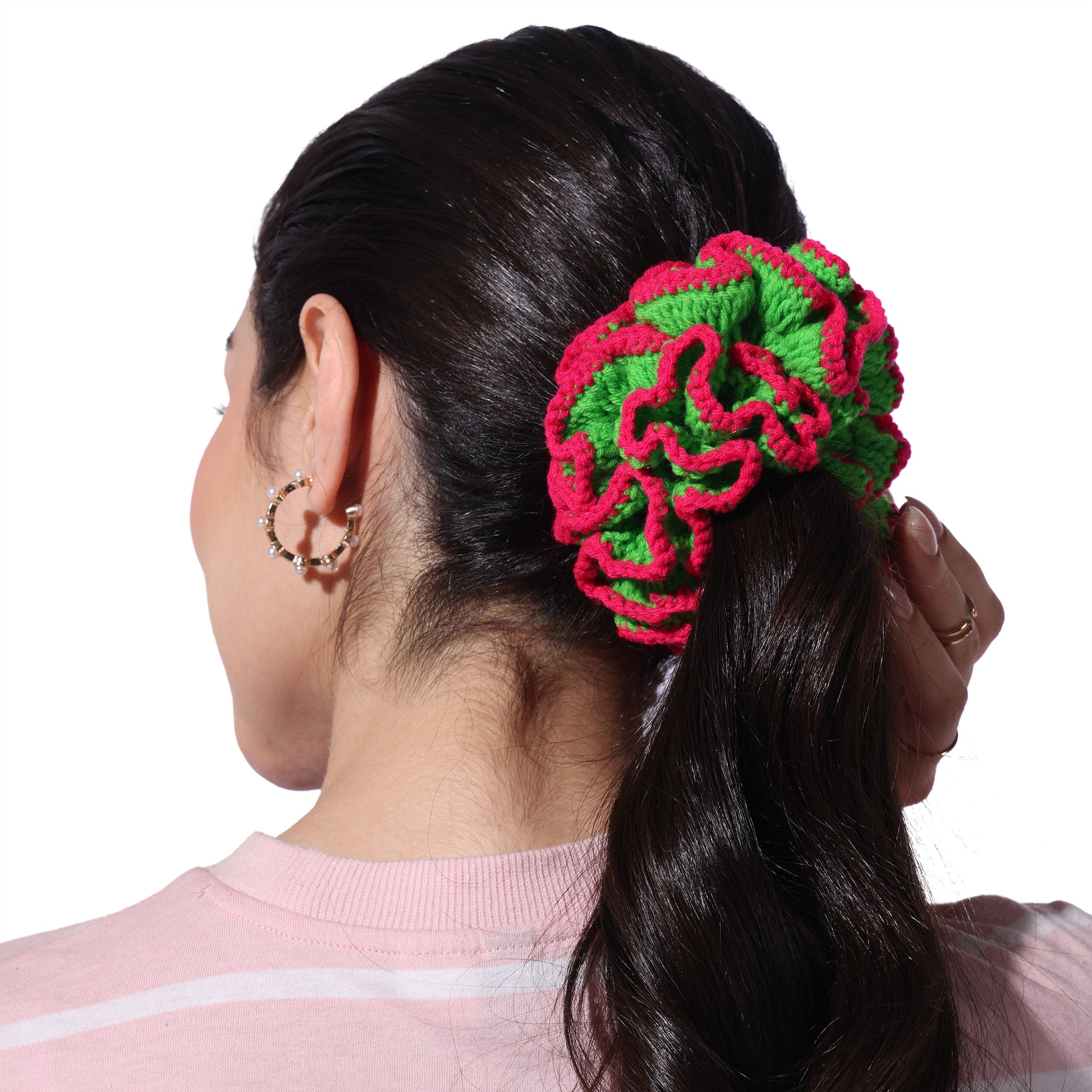 Details : Add a touch of charm and comfort to your hair game with our Crochet Handmade Scrunchie – a delightful blend of cute aesthetics and everyday function. Lovingly handcrafted with soft yarn, this scrunchie is gentle on your hair, prevents breakage, and looks oh-so-pretty on your wrist too!. Whether you're tying up a bun or accessorizing your braid, this scrunchie adds that perfect boho vibe to your look.