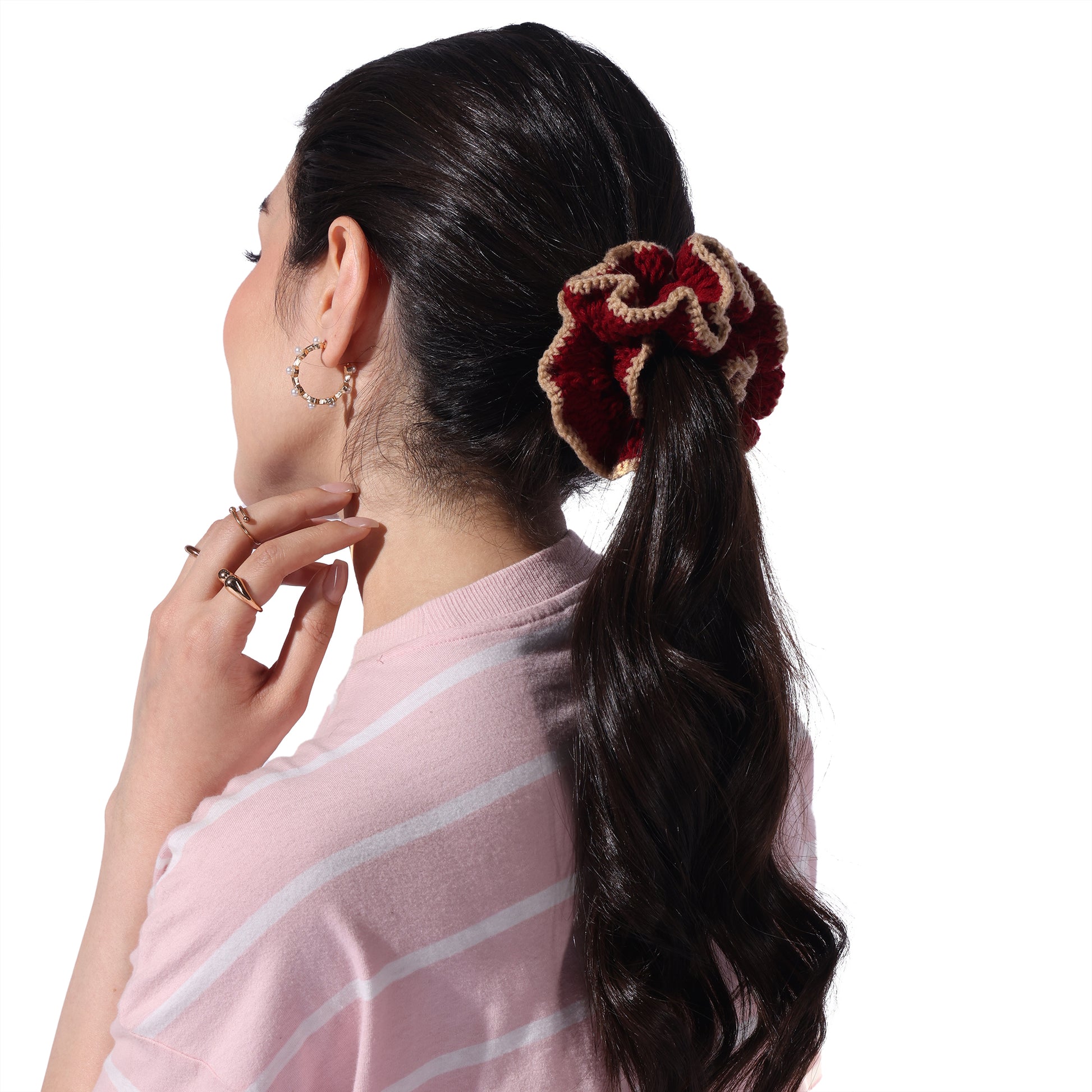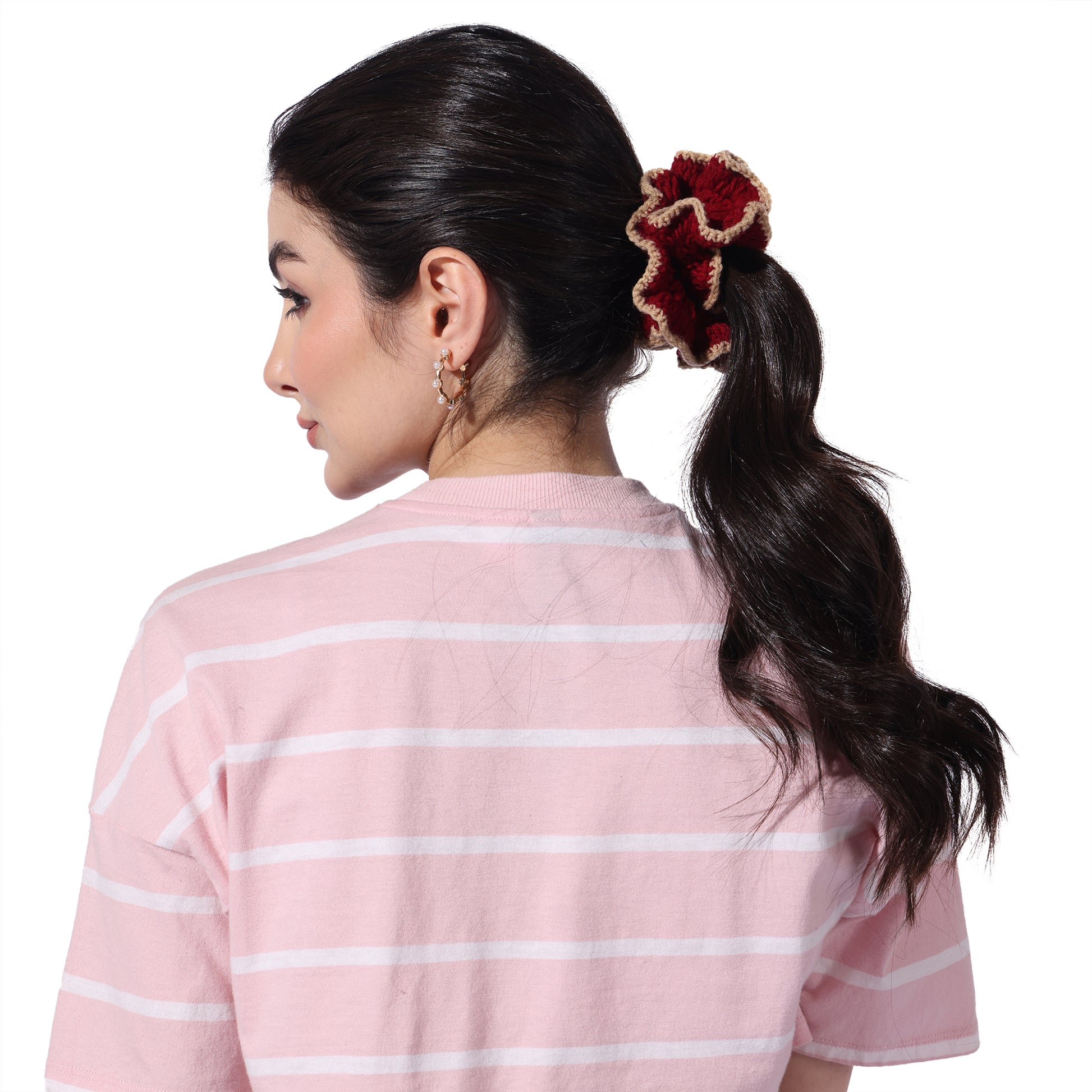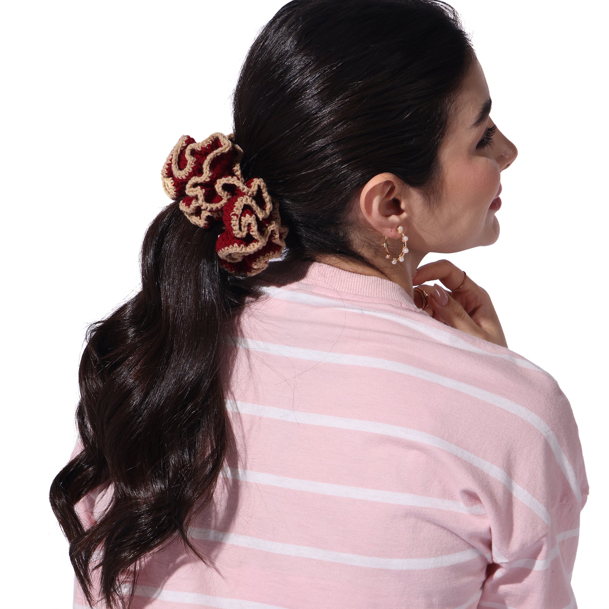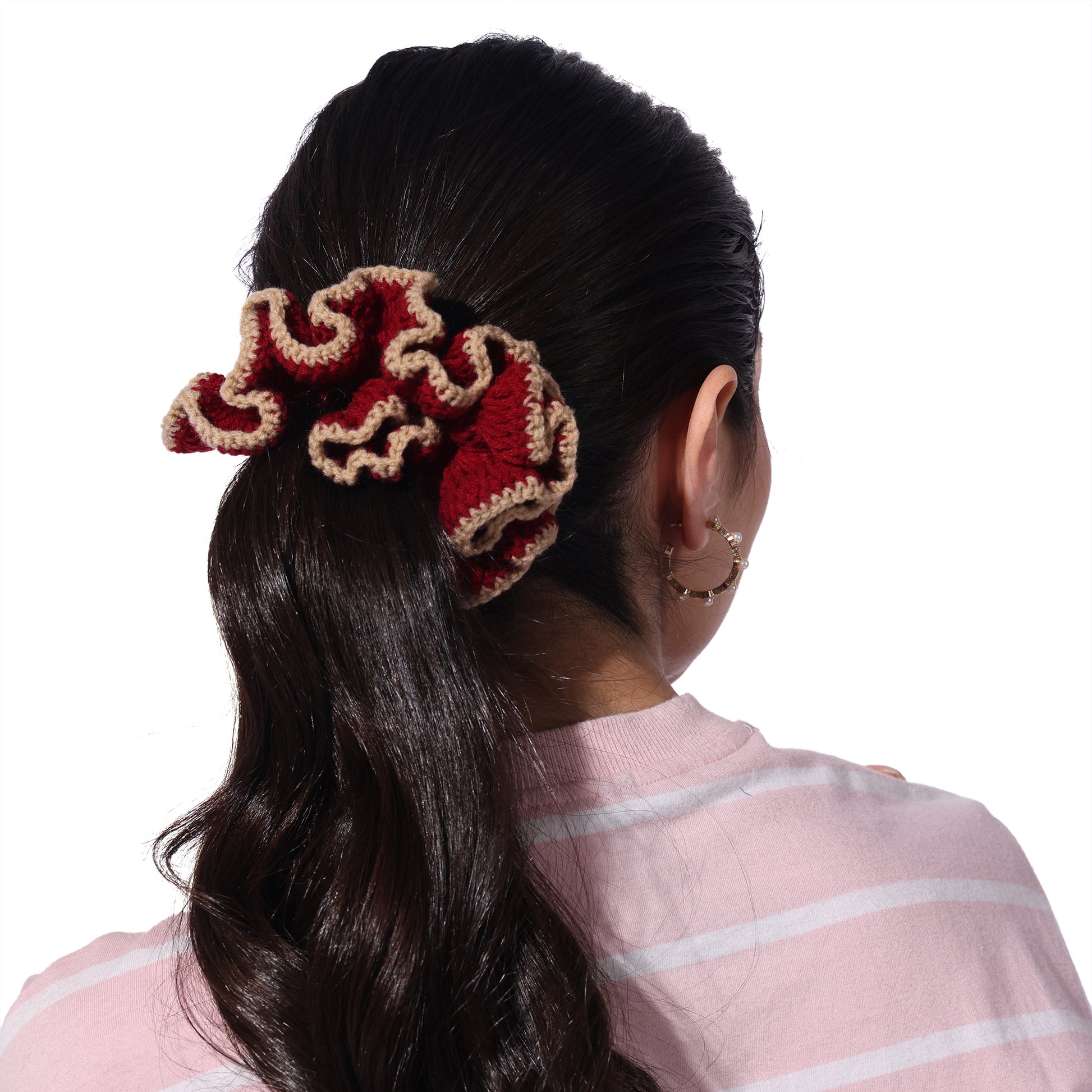 Details : Add a touch of charm and comfort to your hair game with our Crochet Handmade Scrunchie – a delightful blend of cute aesthetics and everyday function. Lovingly handcrafted with soft yarn, this scrunchie is gentle on your hair, prevents breakage, and looks oh-so-pretty on your wrist too!. Whether you're tying up a bun or accessorizing your braid, this scrunchie adds that perfect boho vibe to your look.